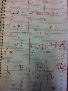 Tras el guión había que hacer un storyboard del corto. En este punto me gustaría comentar que este proyecto ha servido también para que los niños/as aprendan conceptos audiovisuales como: escena, plano, secuencia, guión, trama, storyboard, etc. El storyboard consiste en plasmar en dibujos los distintos planos del corto antes de empezar a rodar.